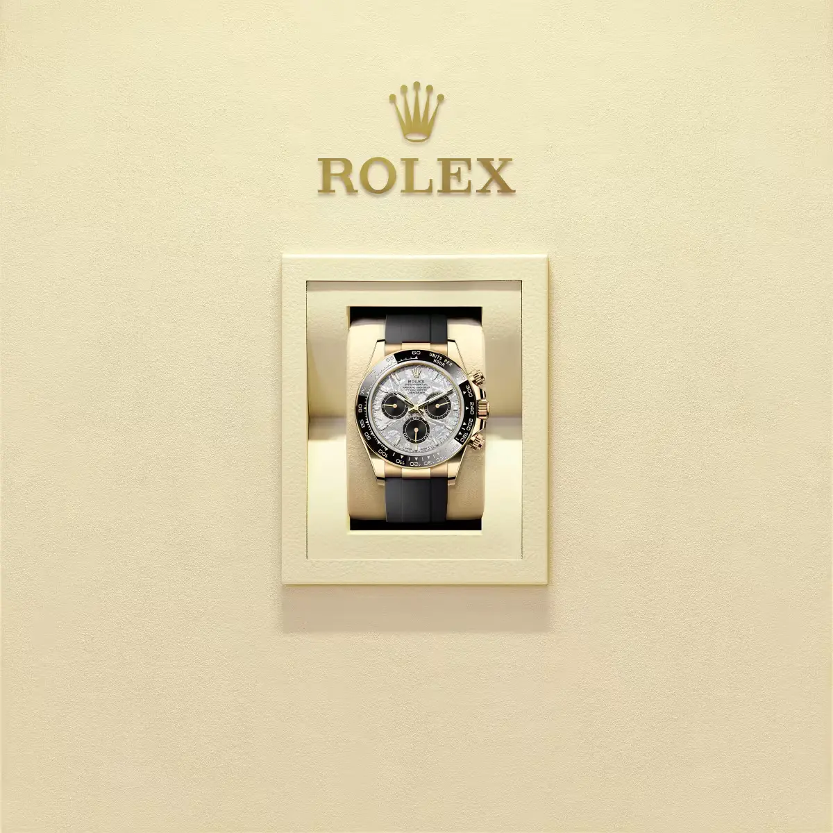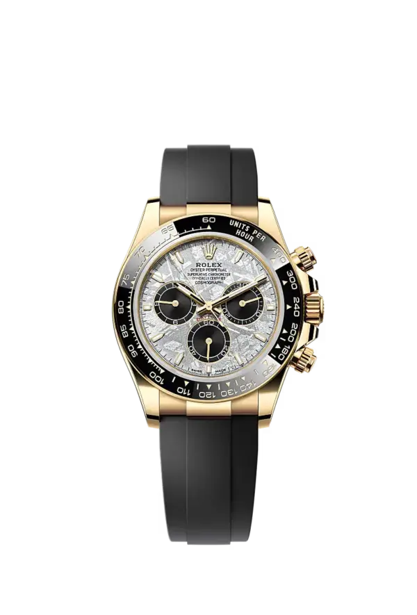 This Oyster Perpetual Cosmograph Daytona is crafted in 18 ct yellow gold with a black meteorite dial and an Oysterflex bracelet , featuring a black Cerachrom bezel and engraved tachymetric scale.